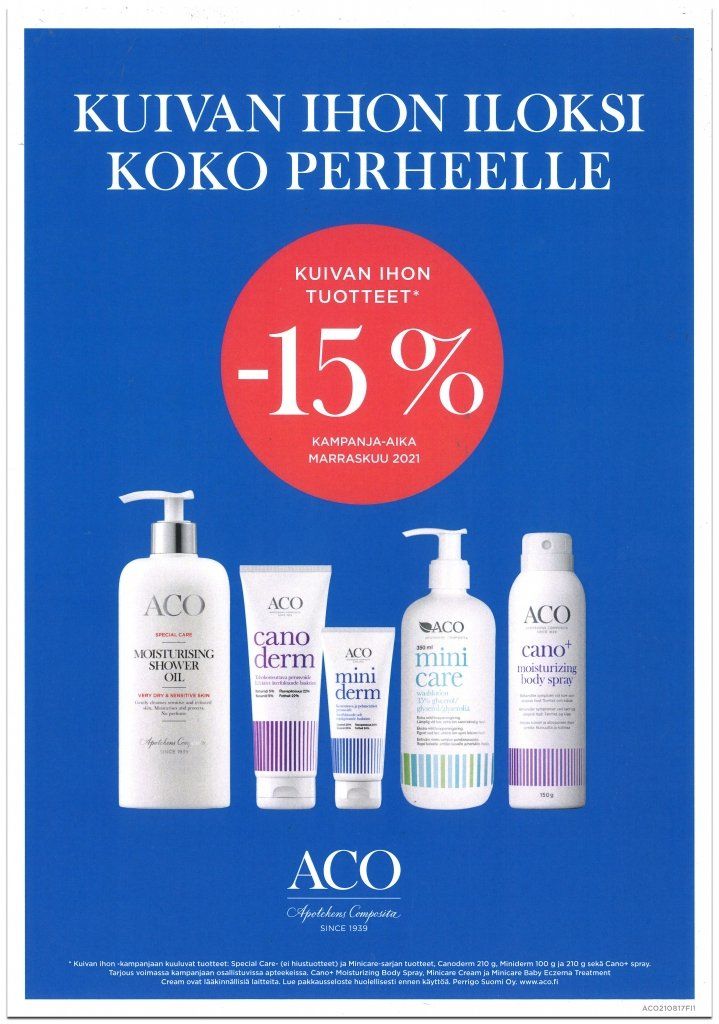 Kuivan ihon kampanjaan kuuluvat: Special Care ja Minacare-sarjan tuotteet. Canoderm 210 g, Miniderm 100 g ja 210 g, Perheen pienimmille Minicare baby excema treatment ja Minicare.