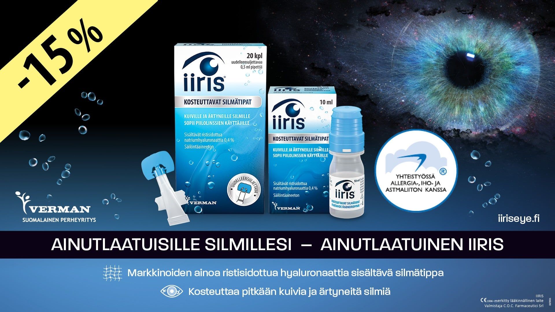 Pitkään kosteuttavat silmätipat. Iiris silmätipat sisältävät ainutlaatuisen patentoidun teknologian, joka kosteuttaa silmiä pitkään. Soveltuu päivittäiseen käyttöön. Kehitetty yhteistyössä Allergia-, Iho- ja Astmaliiton kanssa.